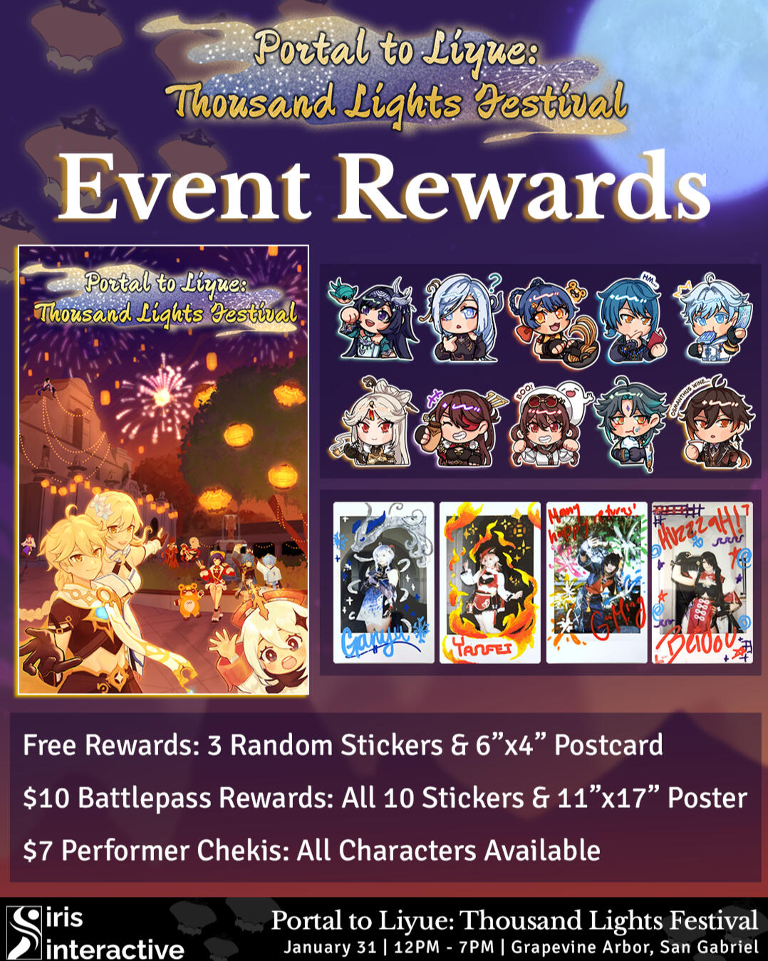 Welcome to Portal to Liyue: Thousand Lights Festival! Come to IRIS Interactive’s FREE immersive experience, created by and run for fans of Genshin Impact. Celebrate the festivities with your favorite Liyue characters by playing spice challenges at Wanmin Restaurant, rocking carnival games at Chasm Carnival, creating wish tags at Yiyan Temple, and more! All participants will receive exclusive rewards for taking part in our celebration.Right after IRIS Interactive’s immersive experience is a Genshin Impact themed concert hosted by the San Gabriel Valley Symphony! Admission to the concert must be purchased separately.